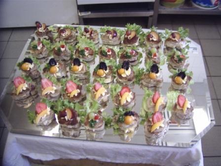 Fleischplatte mit Roastbeef rosa, Pute, gefüllte Schweinesteaks Berliner Bouletten Melonenplatte mit Schinken Räucherfischplatte mit Forelle, Heilbutt und Lachs Bohnensalat mit Schafskäse Schichtsalat mit zwei Dressings Warmanteil